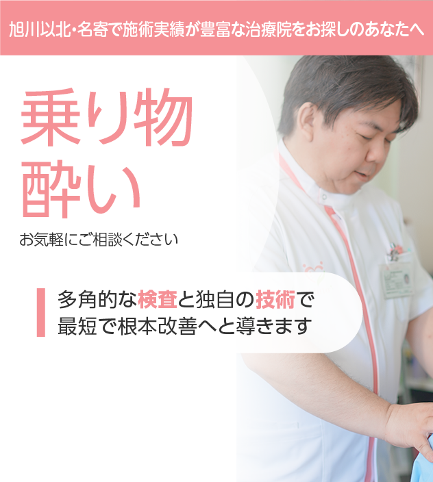 抗ヒスタミン剤を中心とした酔い止め薬の処方により、自律神経の興奮を抑制し症状の予防や軽減を図る
